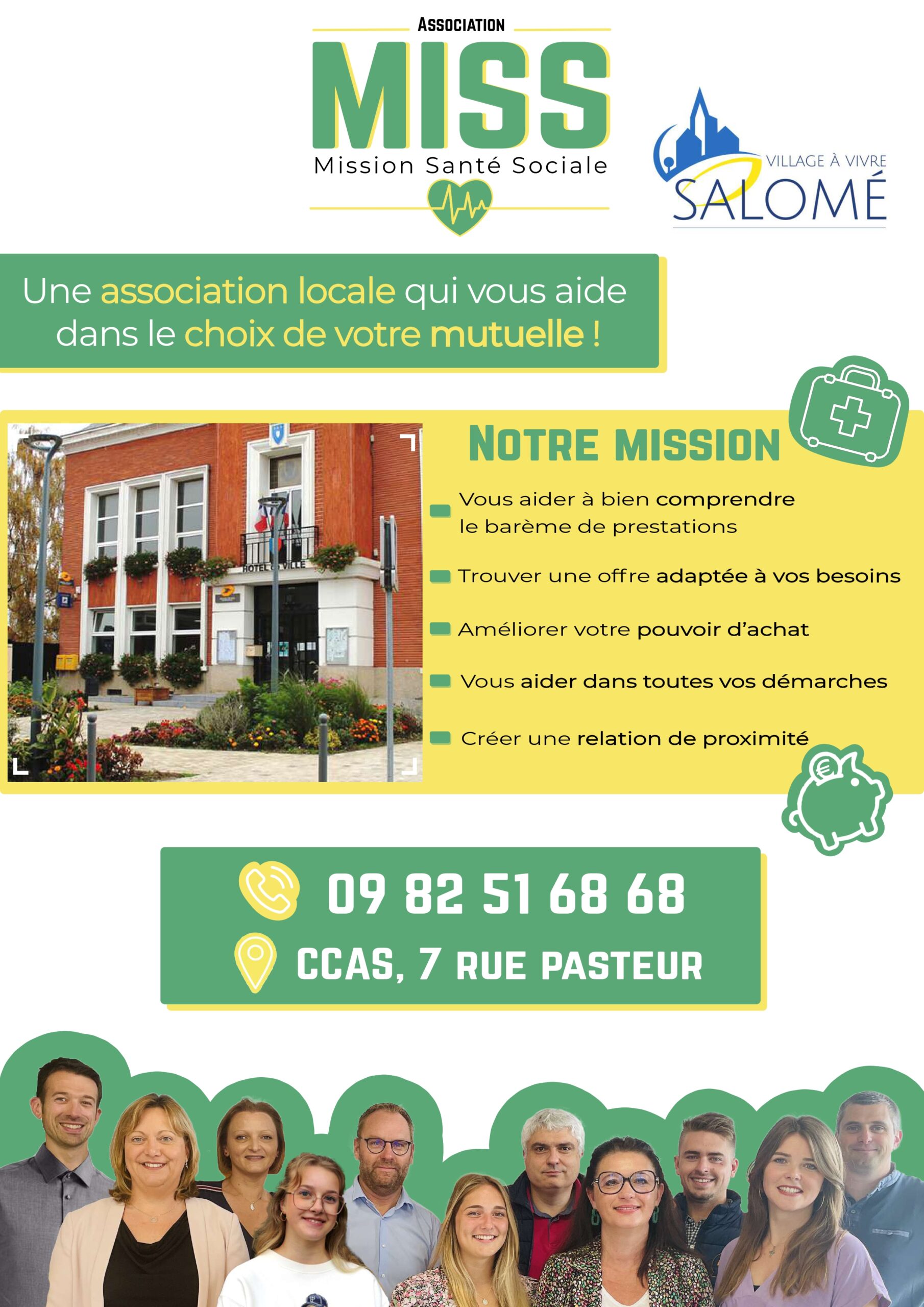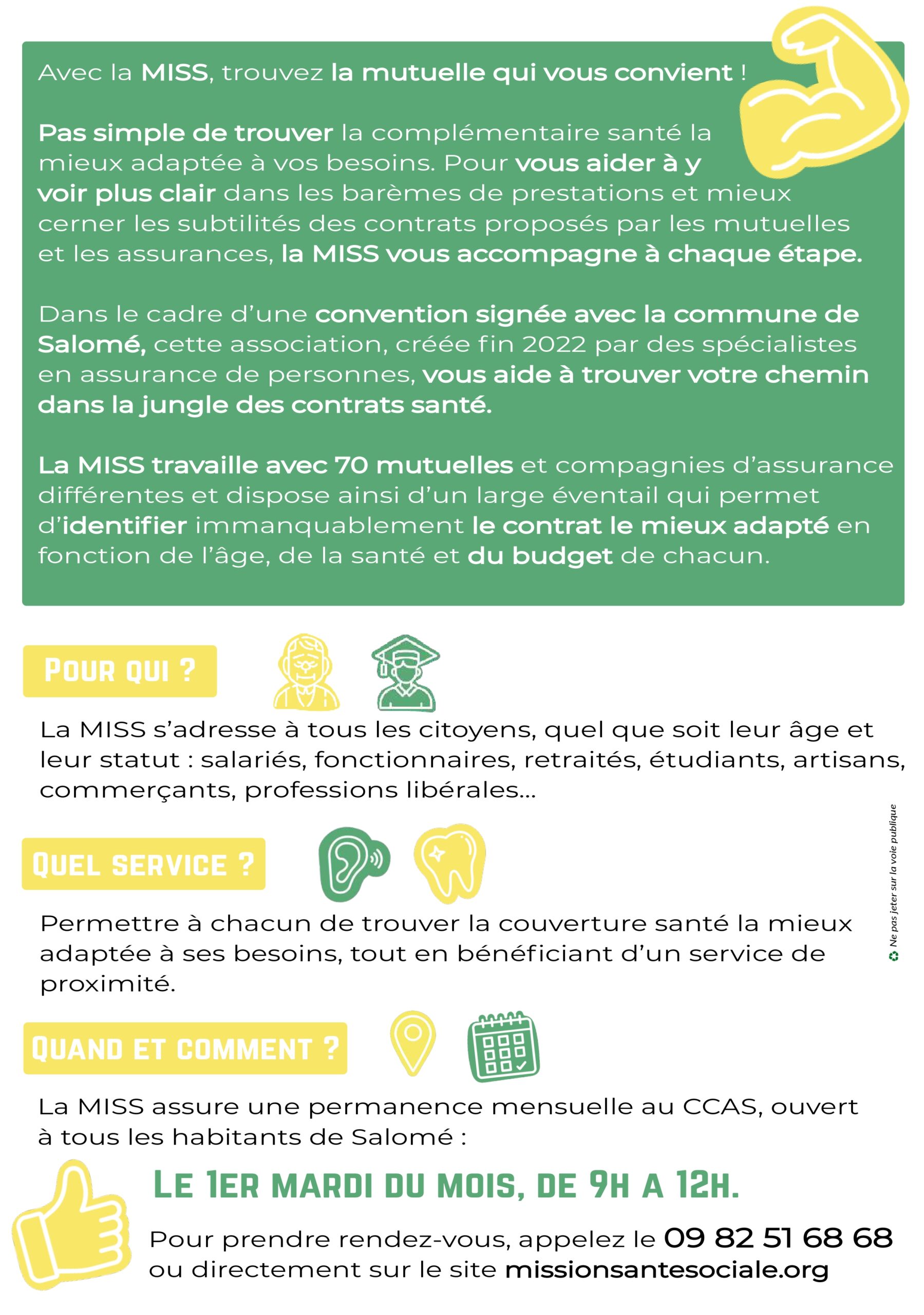 La MISS assure une permanence mensuelle en au CCAS de Salomé le 1er Mardi de chaque mois de 9h à 12h, sur rendez-vous au 09 82 51 68 68 ou directement sur notre site internet : https://missionsantesociale.org/